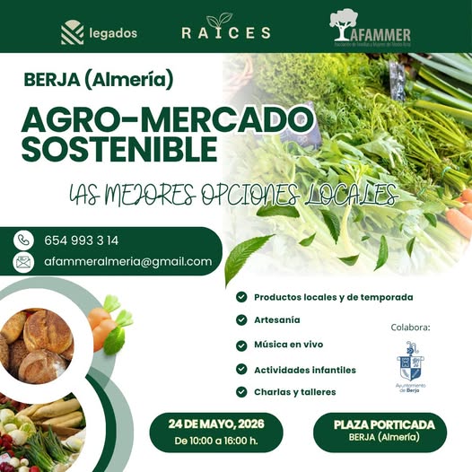 Berja celebrará el próximo 24 de mayo de 2026 el Agro-Mercado Sostenible en Berja, una cita que impulsará el consumo responsable. El evento tendrá lugar en la Plaza Porticada, entre las 10:00 y las 16:00 horas. Además, la iniciativa fomentará el desarrollo rural y la visibilidad de pequeños productores.