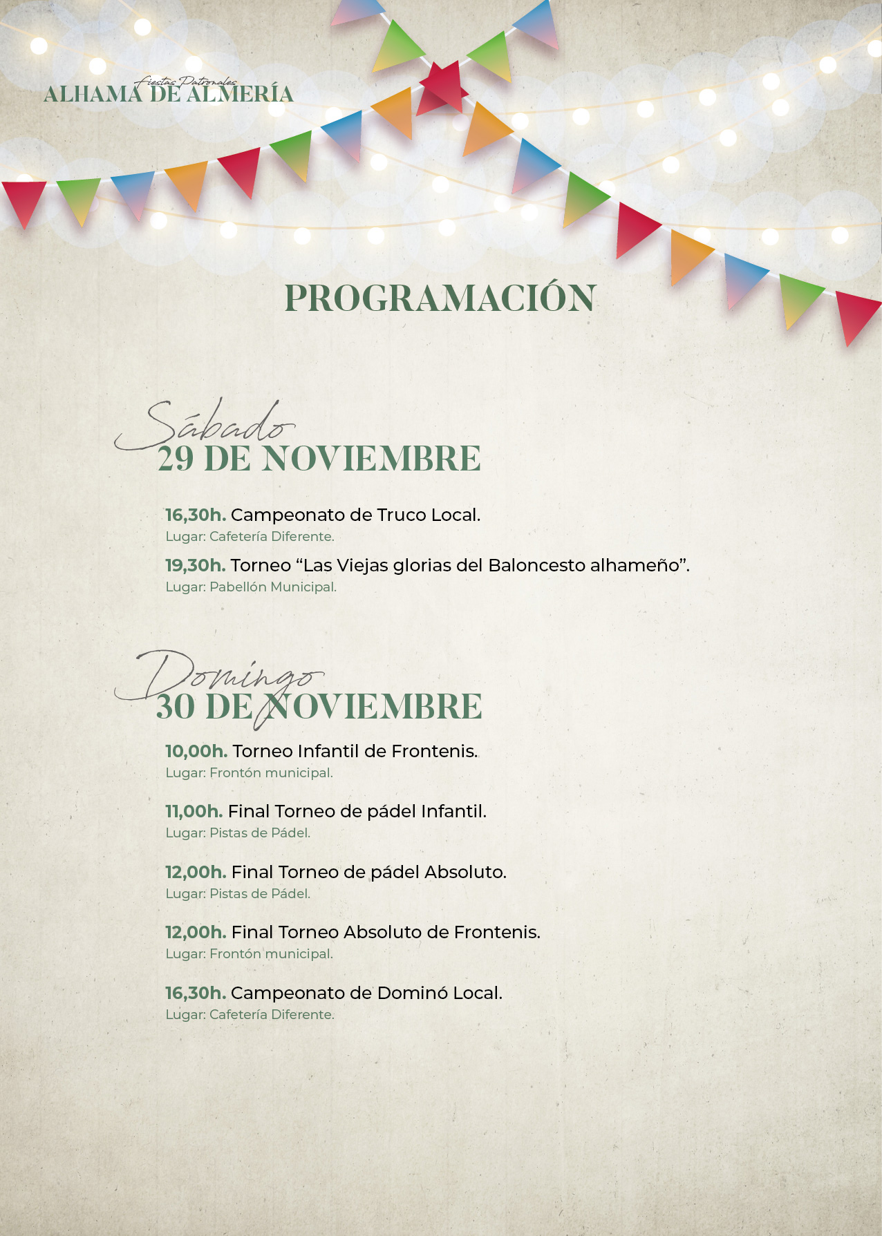 Por la tarde, la cultura será protagonista con la inauguración de ocho exposiciones y la presentación del número 45 de la revista cultural El Eco de Alhama, que celebra su 30 aniversario. A la misma hora, el Frontón Municipal acogerá la final del Campeonato de Andalucía de Pelota Mano Senior. La jornada culminará con una verbena popular amenizada por la orquesta “El Origen” en el Salón Social y la fiesta en la caseta joven.
