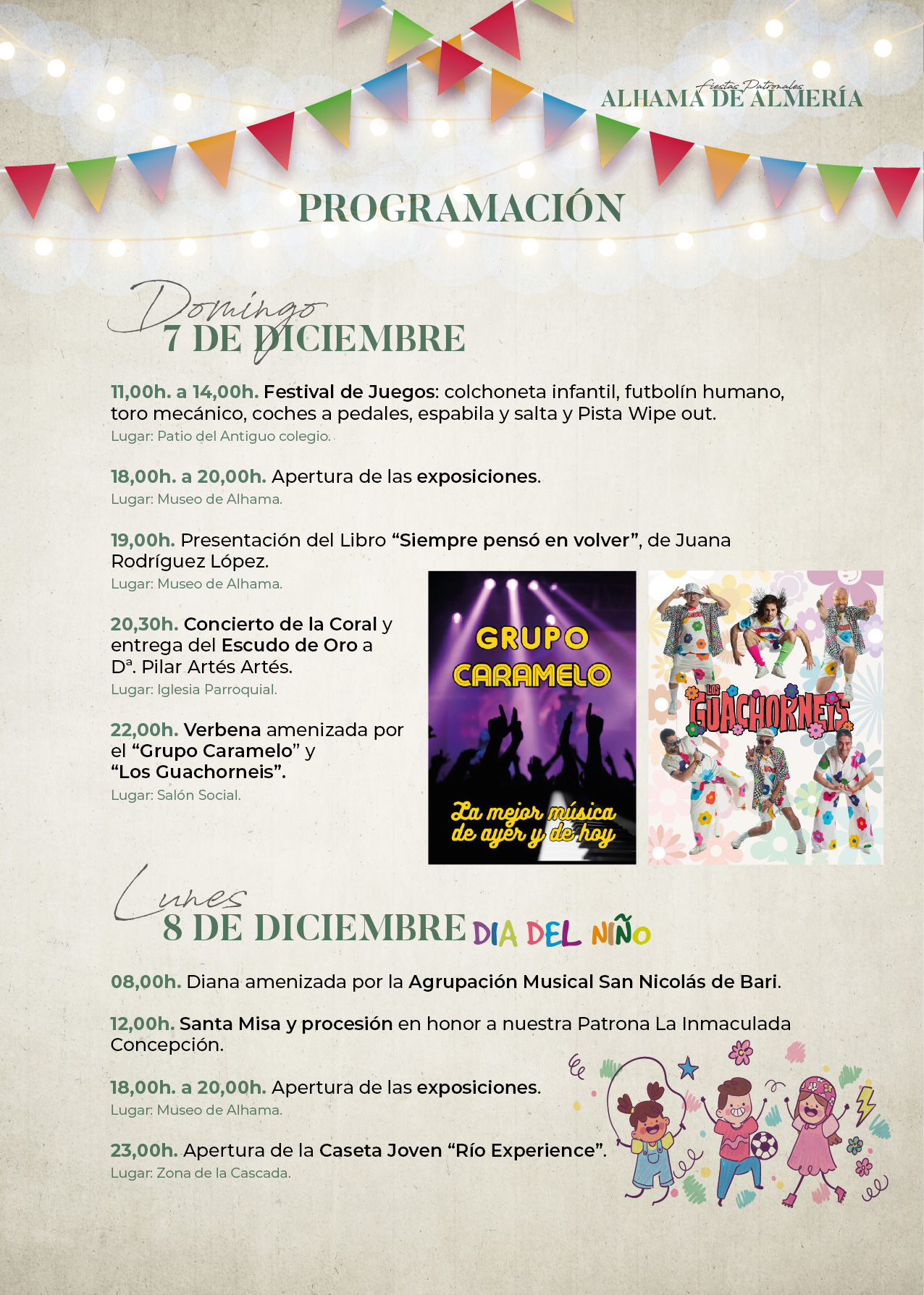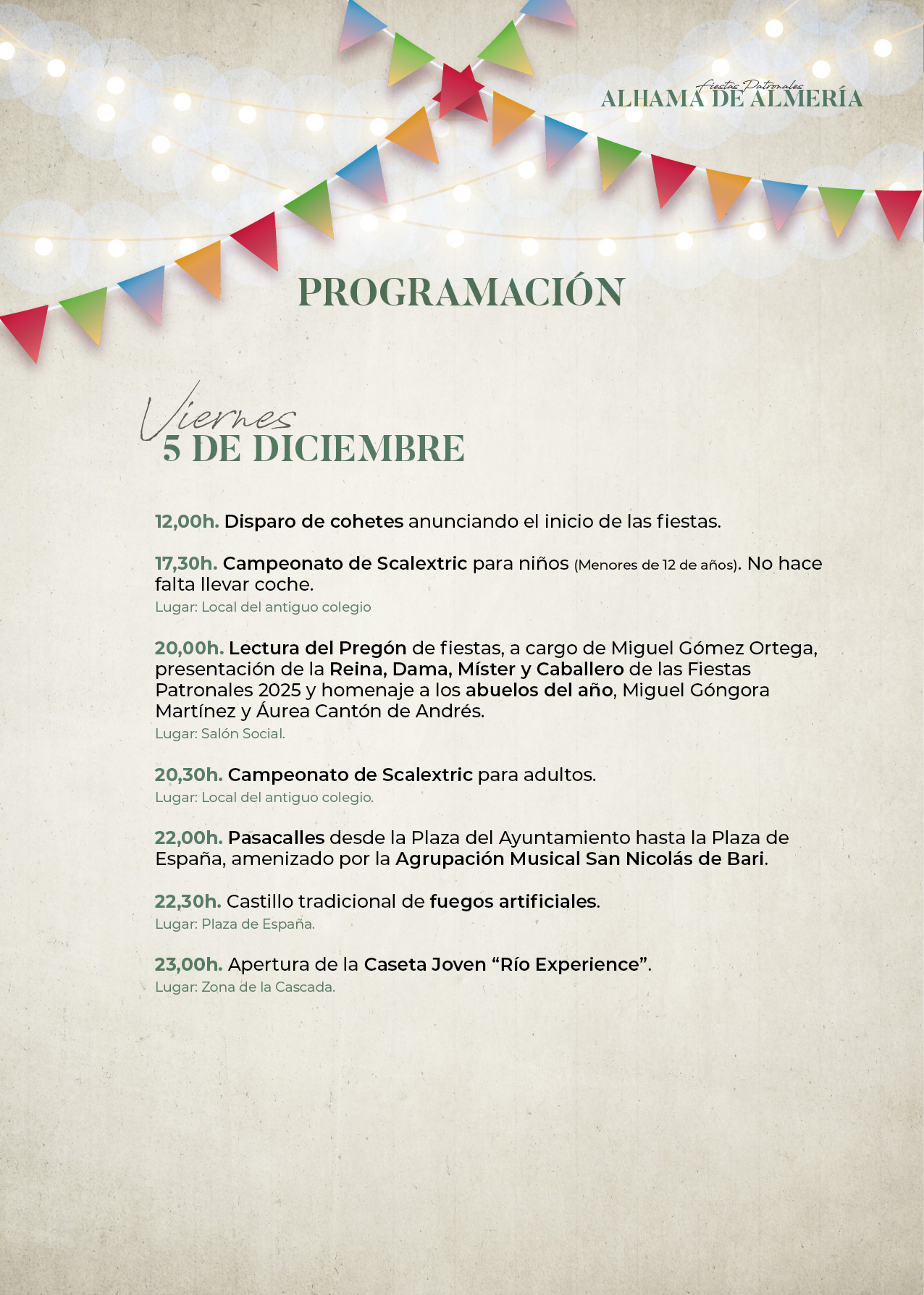 Alhama de Almería ya está lista para vivir intensamente sus Fiestas Patronales en honor a San Nicolás de Bari, una cita que cada año reúne a vecinos y visitantes en torno a la alegría, la tradición y la amistad. Del 5 al 8 de diciembre, el municipio se llenará de color, música y actividades para todas las edades, con una programación pensada para disfrutar en familia.