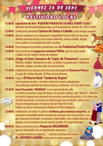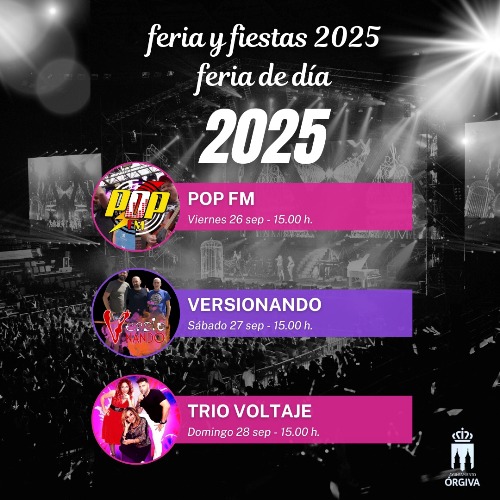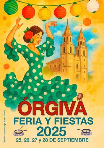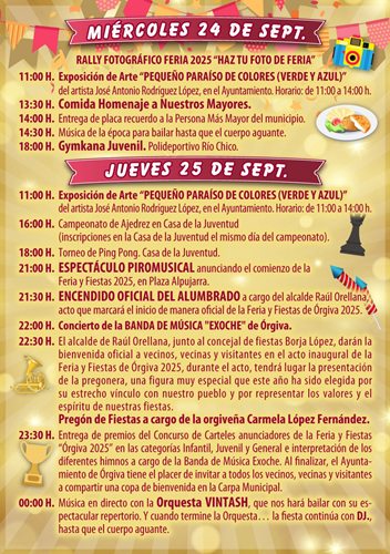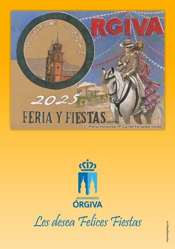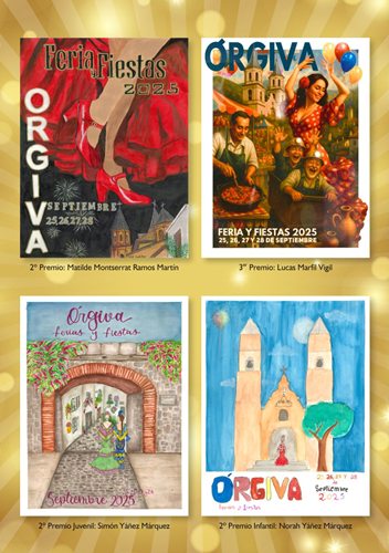 23:30 H. Entrega de premios del Concurso de Carteles anunciadores de la Feria y Fiestas “Órgiva 2025” en las categorías Infantil, Juvenil y General e interpretación de los diferentes himnos a cargo de la Banda de Música Exoche. Al finalizar, el Ayunta-miento de Órgiva tiene el placer de invitar a todos los vecinos, vecinas y visitantes a compartir una copa de bienvenida en la Carpa Municipal.