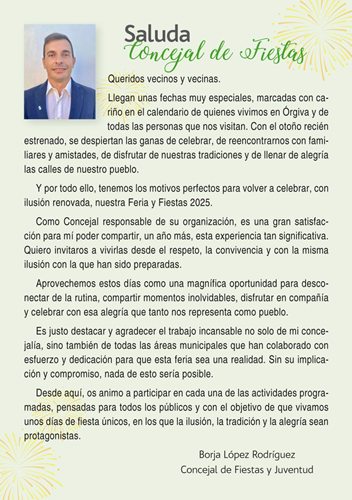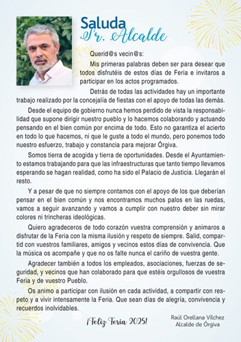 22:30 H. El alcalde de Raúl Orellana, junto al concejal de fiestas Borja López, darán la bienvenida oficial a vecinos, vecinas y visitantes en el acto inaugural de la Feria y Fiestas de Órgiva 2025, durante el acto, tendrá lugar la presentación de la pregonera, una figura muy especial que este año ha sido elegida por su estrecho vínculo con nuestro pueblo y por representar los valores y el espíritu de nuestras fiestas.