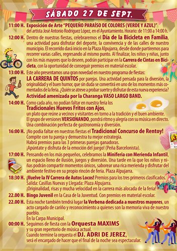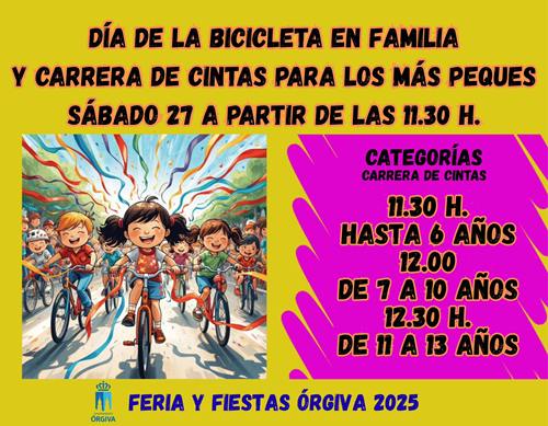 12:00 H. Dentro de nuestras fiestas, celebraremos el Día de la Bicicleta en Familia, una actividad para disfrutar del deporte, la convivencia y de las calles de nuestro municipio. El recorrido dará inicio en la Plaza Alpujarra, desde donde partiremos para recorrer varias calles, regresando al mismo punto. Al finalizar, los niños y niñas, junto con los más mayores que lo deseen, podrán participar en la Carrera de Cintas en Bicicleta, con la oportunidad de conseguir premios en material escolar.