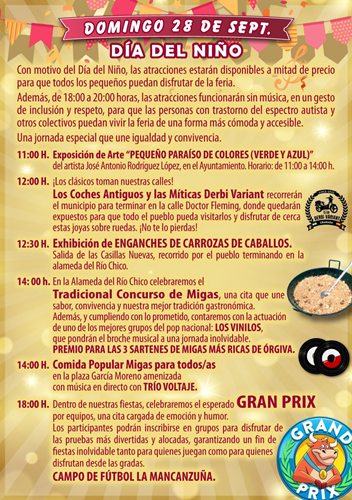 17:00 H. Pensando en los más pequeños, celebramos la Miniferia con Merienda Infantil, un espacio lleno de ilusión, juegos y diversión. Una tarde en la que los niños y ni-ñas podrán compartir momentos únicos, saborear una rica merienda y disfrutar del ambiente festivo en su propio rincón de feria. Plaza Alpujarra.