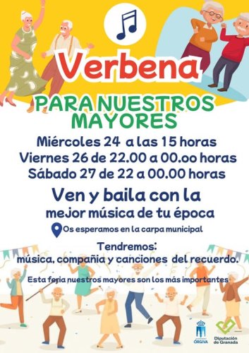 22.00 H. Esta noche también tendrá lugar la Verbena dedicada a nuestros mayores, un acto cargado de cariño y reconocimiento a quienes son la memoria viva de nuestro pueblo. En la Carpa Municipal.