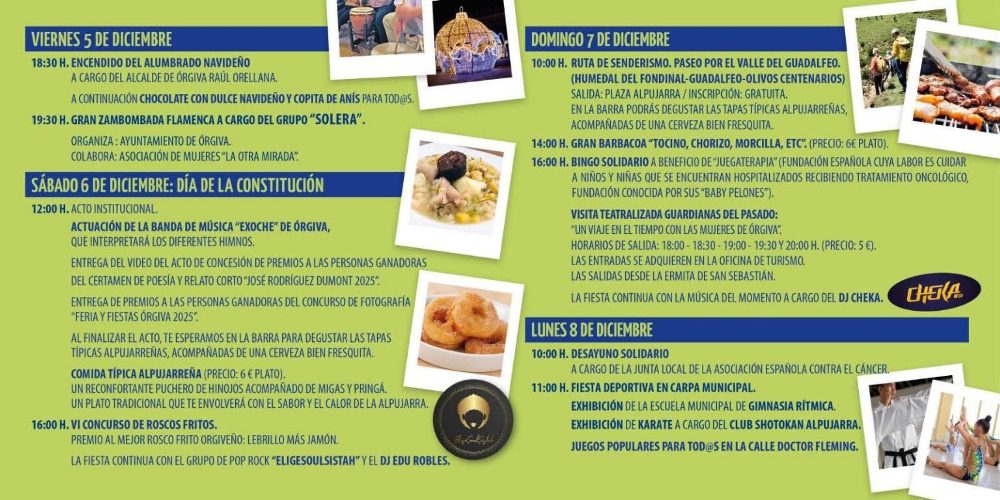 Desde el viernes 5 al lunes 8 de diciembre, el Puente de la Constitución en Órgiva estará lleno de actividad. El Ayuntamiento, con el apoyo de la Diputación de Granada, ha preparado una agenda repleta de opciones culturales, deportivas y gastronómicas pensadas para toda la familia.