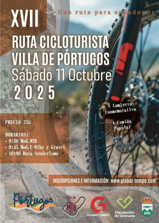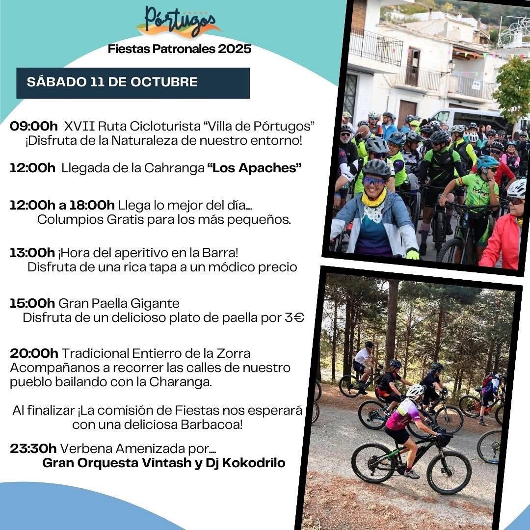 Tras unos días de descanso, el sábado 11 de octubre tendrá lugar la XVII Ruta Cicloturista “Villa de Pórtugos”, una actividad que combina deporte, naturaleza y compañerismo. Los paisajes de la Alpujarra granadina acompañarán a los ciclistas en un recorrido único. Al mediodía, todos podrán disfrutar de atracciones infantiles y de la Gran Paella Gigante, un clásico que congrega a vecinos y visitantes en torno a la buena mesa.