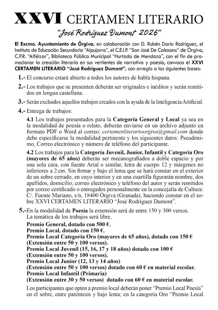 El XXVI Certamen Literario “José Rodríguez Dumont 2026” es fruto del trabajo conjunto entre el Ayuntamiento de Órgiva, el Instituto de Educación Secundaria Alpujarra, el CEIP San José de Calasanz, el CPR Alféizar y la Biblioteca Pública “Hurtado de Mendoza”. Con esta unión de esfuerzos, la localidad reafirma su apuesta por la promoción de la cultura y la literatura como herramienta de expresión y cohesión social.